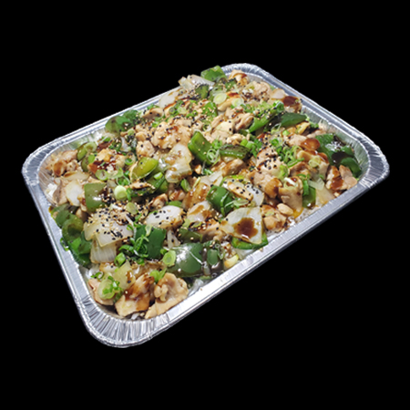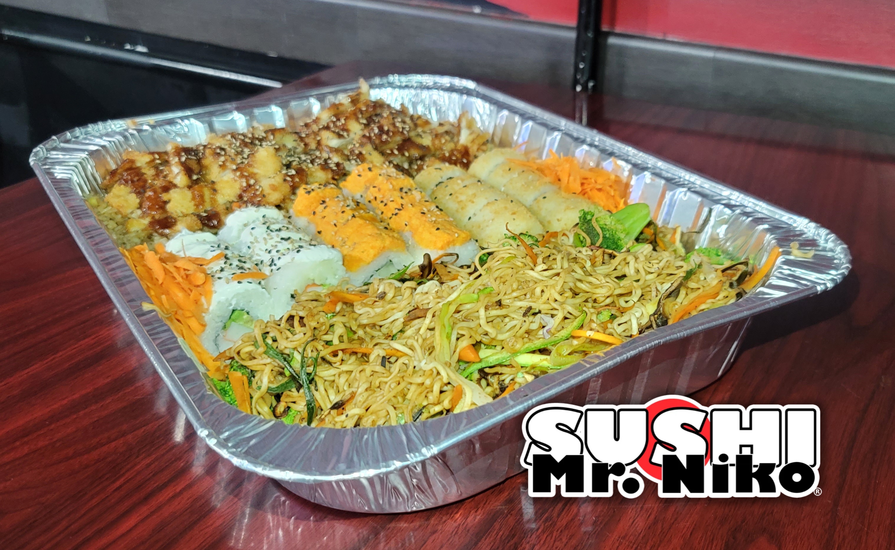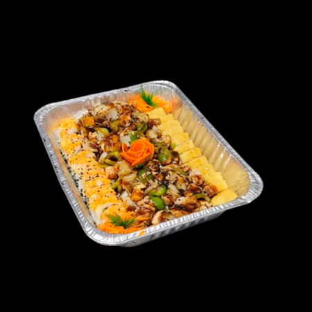CHAROLA CON YAKIMESHI ACOMPAÑADA DE POLLO EMPANIZADO, 1 ORDEN DE YAKISOBA DE VERDURAS, 1 ROLLO EMPANIZADO RELLENO DE QUESO CREMA, CARNE Y POLLO, 1 ROLLO NATURAL FORRADO DE TAMPICO RELLENO DE PEPINO Y QUESO CREMA Y 1 ROLLO NATURAL FORRADO DE QUESO CREMA, RELLENO DE AGUACATE Y SURIMI