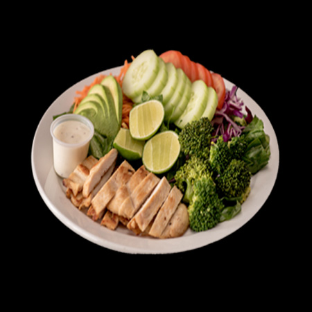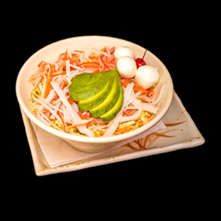 ENSALADA DE PEPEINO CON SURIMI, Y TAMPICO, SERVIDO CON UNA PORCION DE QUESO Y AGUACATE.