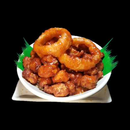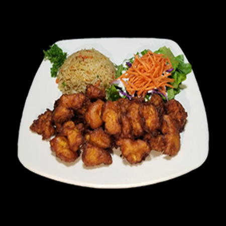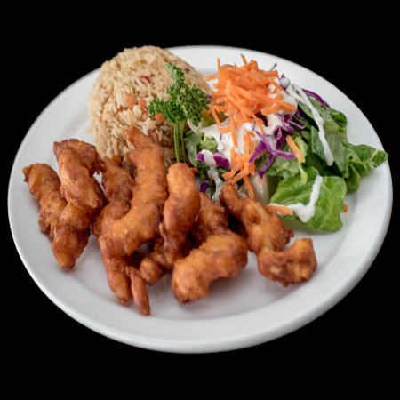TROZOS DE PECHUGA DE POLLO CAPEADOS CON PASTA PICANTE, ACOMPAÑADOS CON ARROZ Y ENSALADA SALMON $349 CAMARON $199