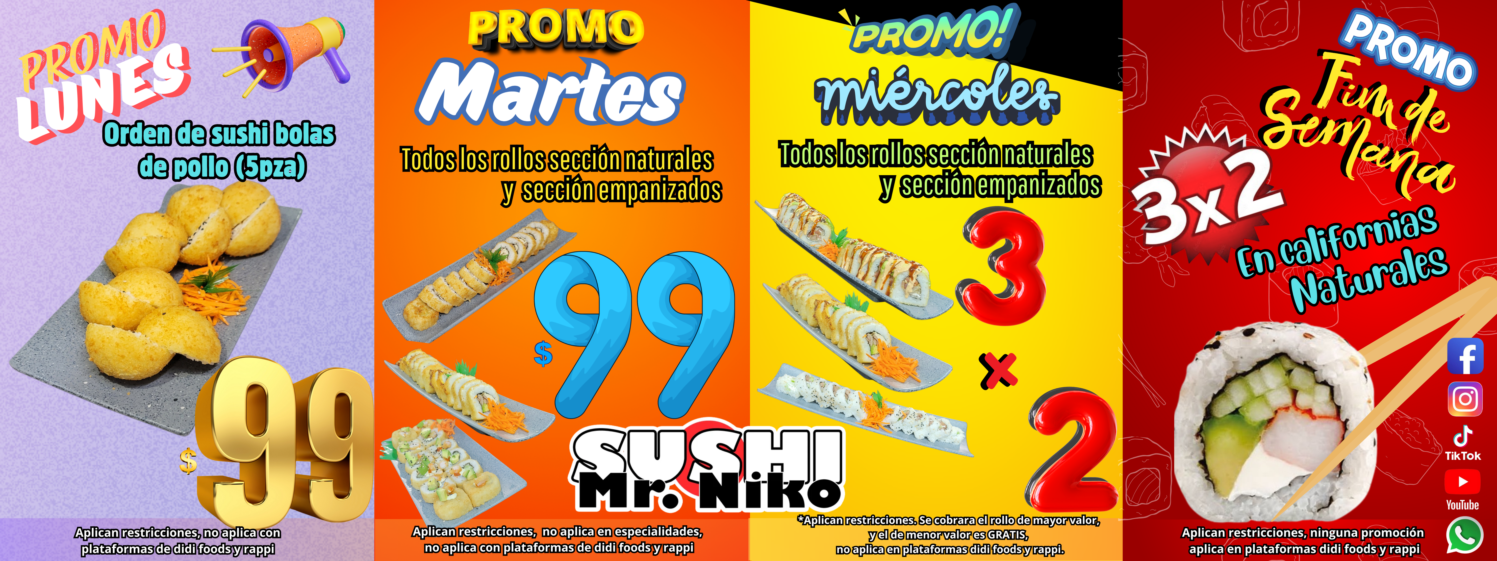 Así fue como nació SUSHI MR. NIKO, en septiembre del 2008 en Mexicali, dándose a conocer por primera vez en las famosas FIESTAS DEL SOL, y después estableciéndose en Blvd. Benito Juárez, con horarios muy extensos los cuales comenzaban de 12:00pm y finalizaban a las 5:00am.