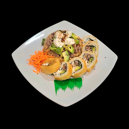 MEDIO CALIFORNIA DE CAMARON, POLLO EMPANIZADO, 1 PORCION DE ENSALADA Y 1 PORCION DE ARROZ YAKIMESHI.